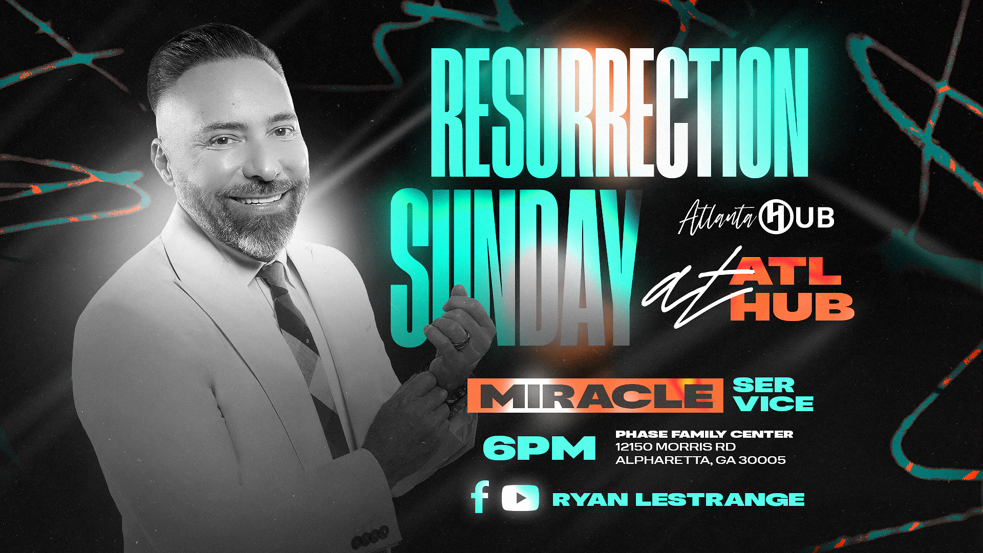 Join us for Resurrection Sunday at ATL Hub! We’re gathering for a powerful Miracle Service at the Phase Family Center, located at 12150 Morris Road in Alpharetta, Georgia. Service begins at 6:00 PM, and you can also join us live online on Facebook and YouTube with Ryan Lestrange. This is a night to experience healing, miracles, and the resurrection power of Jesus, continuing everything God is going to do on Good Friday. And we have something for the entire family.