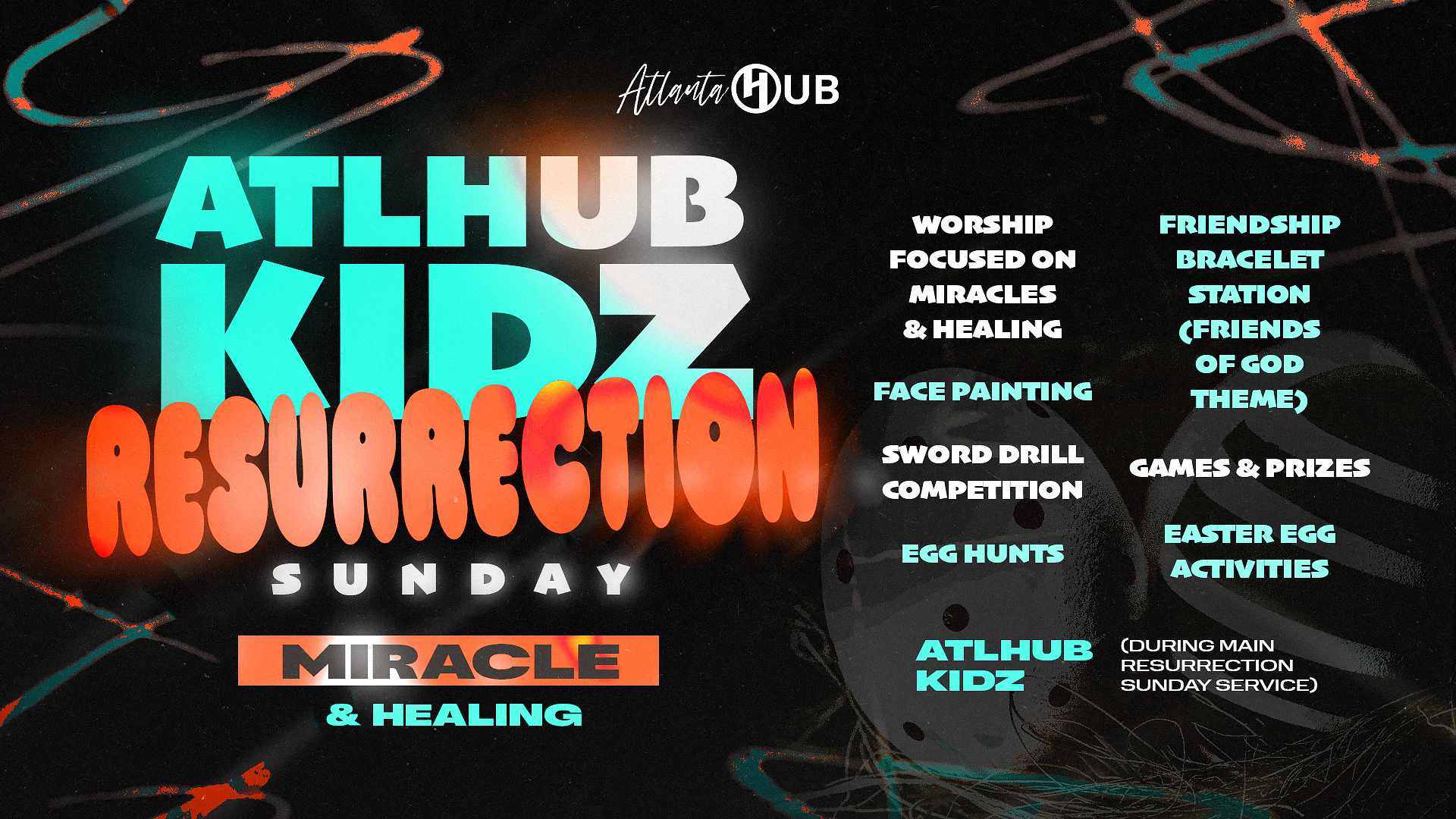 Our ATL Hub Kidz will be having their very own Resurrection Sunday experience happening during the main service—centered around miracles and healing. They’ll enjoy worship, face painting, games, prizes, Easter egg hunts, and more, all in a fun, faith-filled environment designed just for them. Bring your family, invite someone, and come expecting an unforgettable encounter.